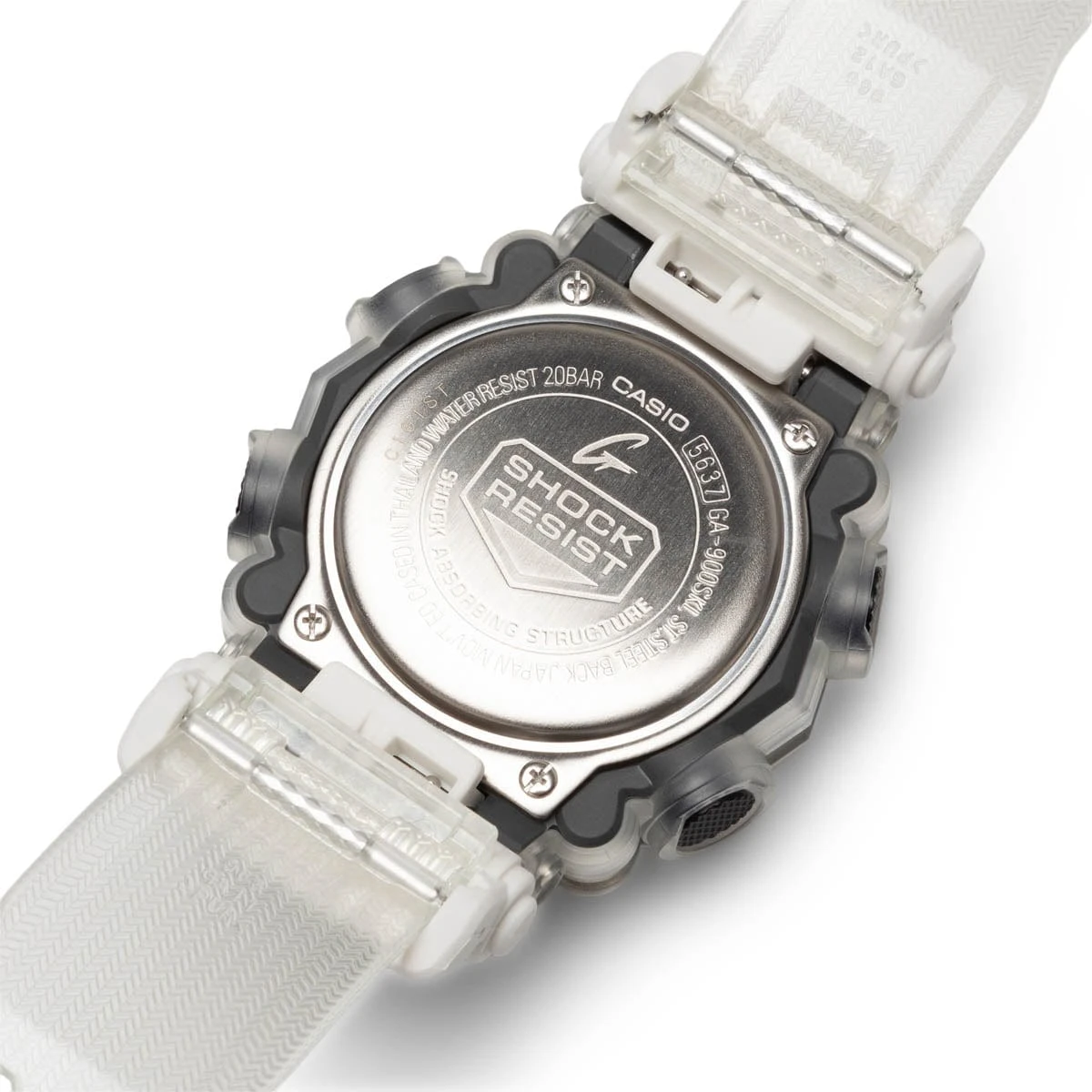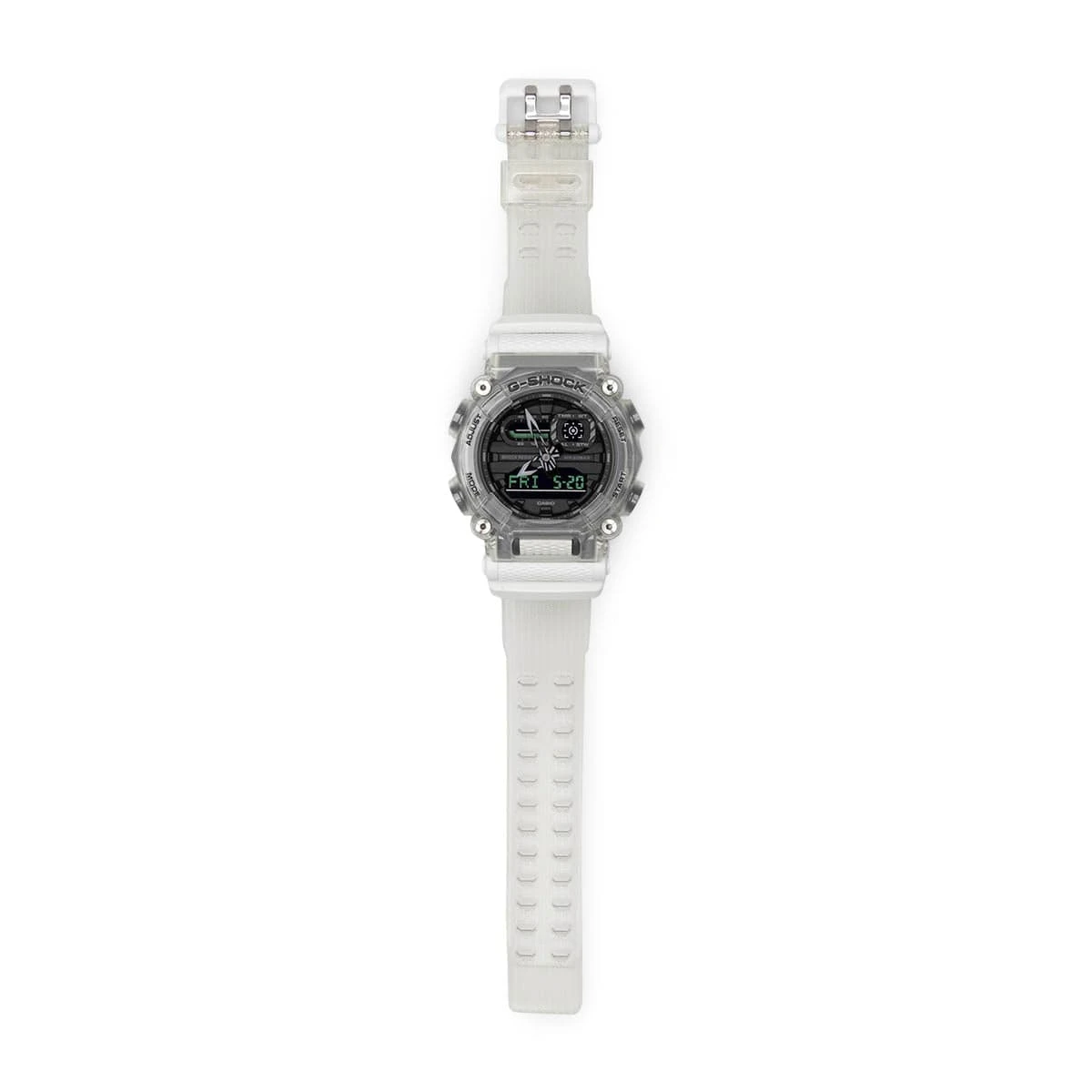 Inspired by a surge of sound flowing over a dance floor, these watches translate this vision into color and design for a stereophonic take on the rugged GA900 with its sturdy oversized case featuring analog hands and digital display.